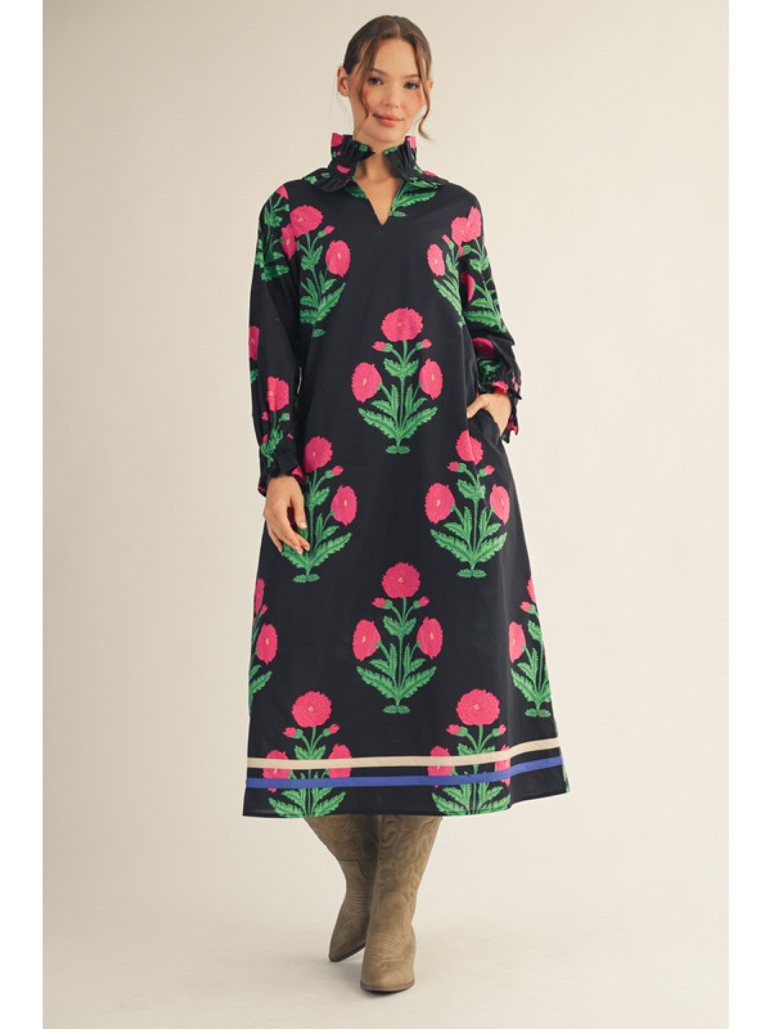 Ruffled long sleeves floral midi dress with ruffle detail high neckline, side pockets, solid tape trim hem.